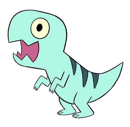 Baby Teeth is a tiny, light blue theropod dinosaur (possibly an Allosaurus), with three teal stripes running down his back. He has large eyes with black pupils, and a toothed mouth.