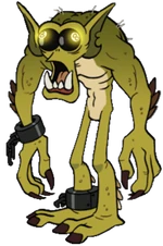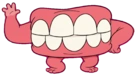 As his name suggests, Teeth is a sentient pair of jaws with stubby arms and legs. He appears rather gluttonous and sadistic after he devours one of the gnomes after Grenda proclaims that the survivors won’t be taken alive, though said gnome is belched out unharmed. He might be a preteen seeing as a picture of him after relocating to a safe dimension depicts him eating lunch in a school cafeteria, implying that he enrolled at a school in his new dimension.