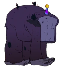 Xanthar is a giant purple demon who walks on all four of his ape-like legs, and has no visible face. In place of his face is a lavender patch much like a loaf of sliced bread. He has small trees growing out of his back and shoulders, and he wears a blue and purple party hat with a yellow ball on top. Xanthar's body is shaped like a cube.
