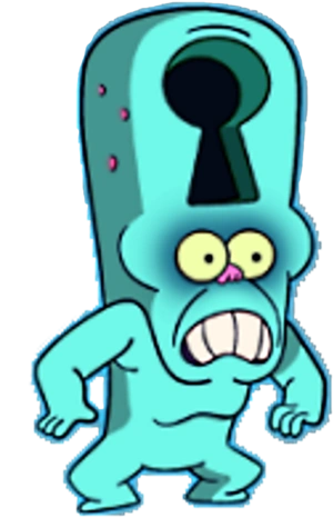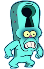 Keyhole has an aqua blue humanoid body with a forehead that resembles a keyhole. Keyhole has a darker shade of blue around his eyes, a pink nose, and a small blue aura. He was once a security guard for the Vault of Infinity, the safe for the multiverse's secrets, but became a criminal after he was caught trying to use his own keyhole to break into his own head and "steal his own thoughts". He apparently had a terrible emo phase in high school and had a band called the Low Keys which he's considering restarting.