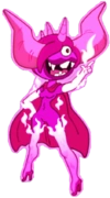 Pyronica is a pink glowing demon with short pink hair, bangs parted across her face, and several small horns across her skull, in between her two other big curved horns. Pyronica has one eye, just above her wide mouth and thick lips, that hide her buck teeth and fangs. Pyronica has a slim humanoid body, and her limbs are made of white flames. Pyronica wears a long pink cape and pink stiletto pumps.