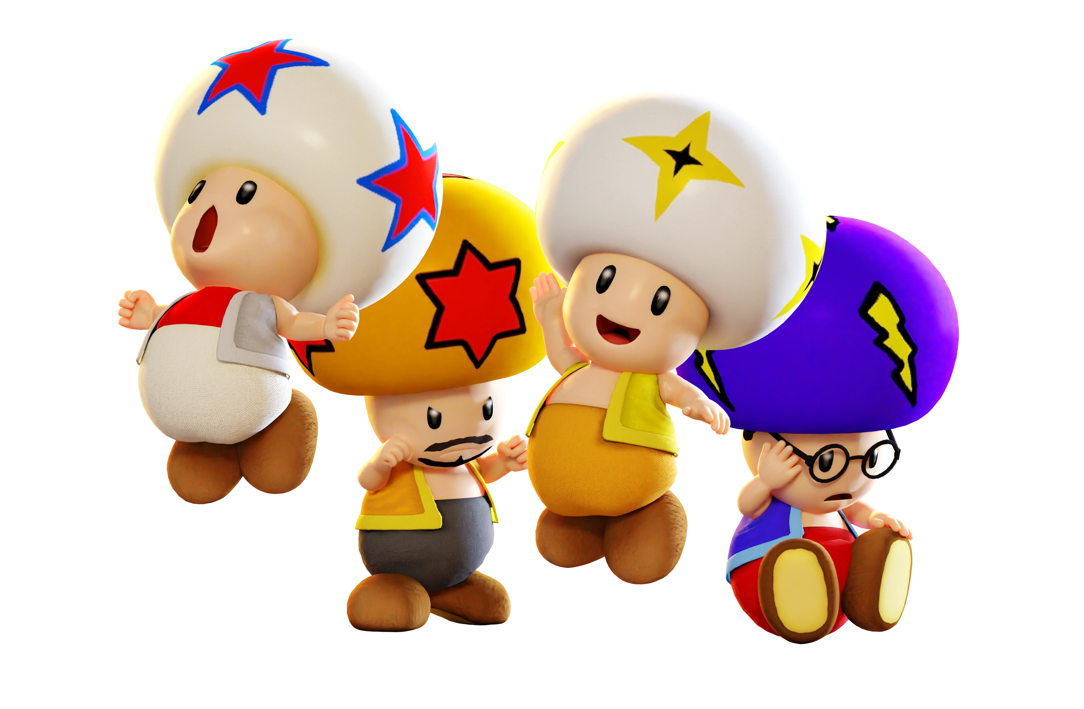 - Toad Bravo: Has a white cap with yellow four-pointed stars that each have small black one in the center. Has a yellow vest and orange pants.