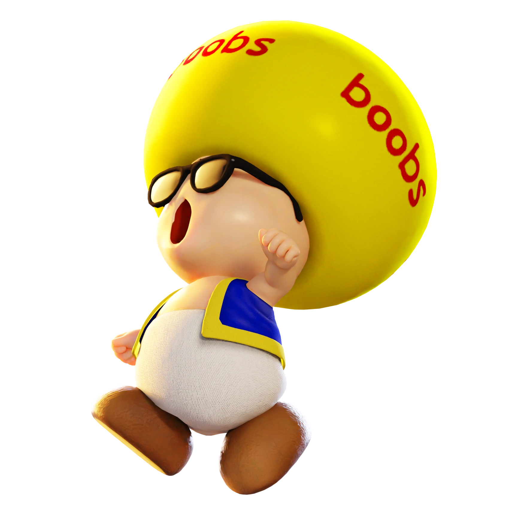 - Toad Bewbs: Has a white cap that has red star with thick blue outlines, with a red shirt and white vest and shorts. Unlike most toads his eyes are white and has a huge disturbing grin.